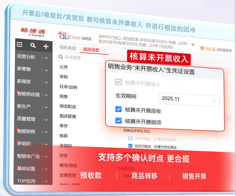 畅捷通T+Cloud针对这一政策,实现了未开票收入的精准核算与一键申报。系统支持自动识别未开票收入场景,生成合规的记账凭证,并与税务申报系统无缝对接,确保企业在税务处理上不留隐患,真正做到“应缴尽缴、合规无风险”。