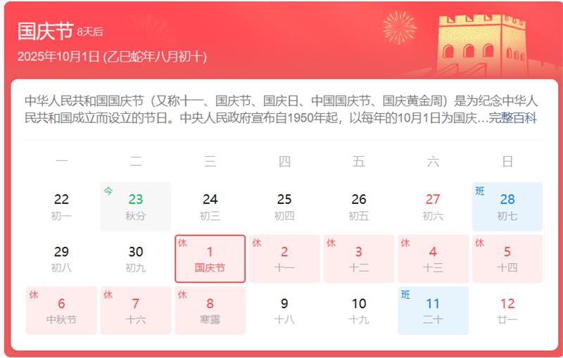 放假时间:2025年10月1日(星期三)至10月8日(星期三)放假调休,共计8天,涵盖国庆节(10月1日-3日)与中秋节(10月7日)法定假日。