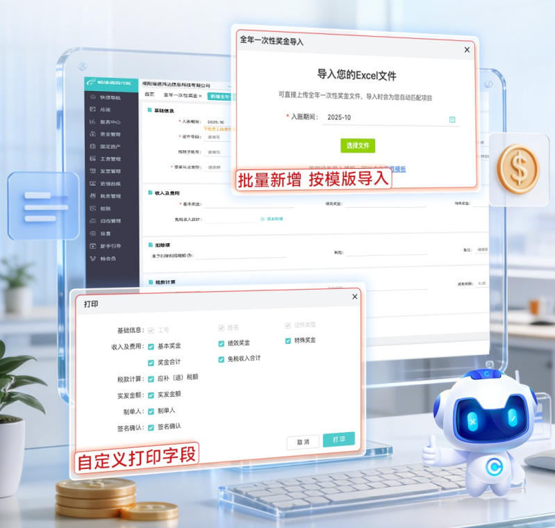 批量导入 + 自定义打印,效率拉满:支持按模板批量导入奖金数据,自定义打印薪资条字段,满足常州企业多样化的发放与归档需求。