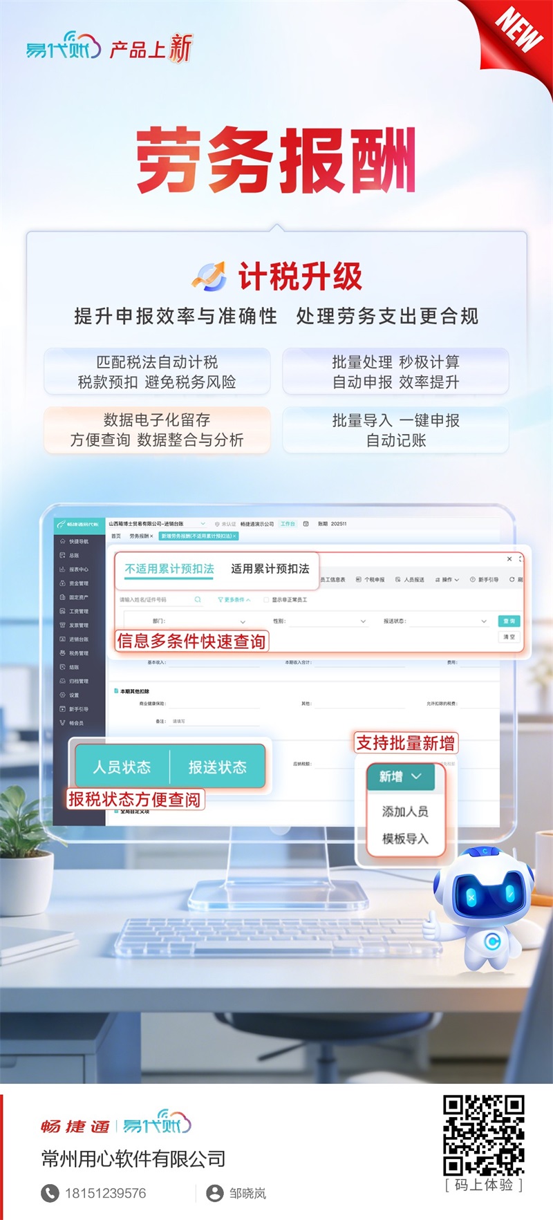 年底财务关账、个税申报、奖金核算…… 每一项都让常州的财务人忙得脚不沾地。面对员工信息零散、奖金计税复杂、劳务报酬申报易错等痛点,畅捷通易代账携手常州用心软件,全新推出三大核心功能升级,从数据源头到计税申报全流程赋能,让常州中小微企业的财务工作真正实现 “合规减负、效率翻倍”!