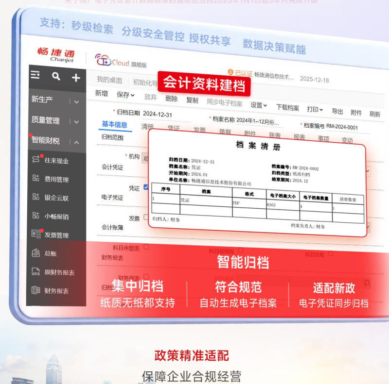 适配“一法两规范”:智能归档电子凭证,满足会计档案新要求。