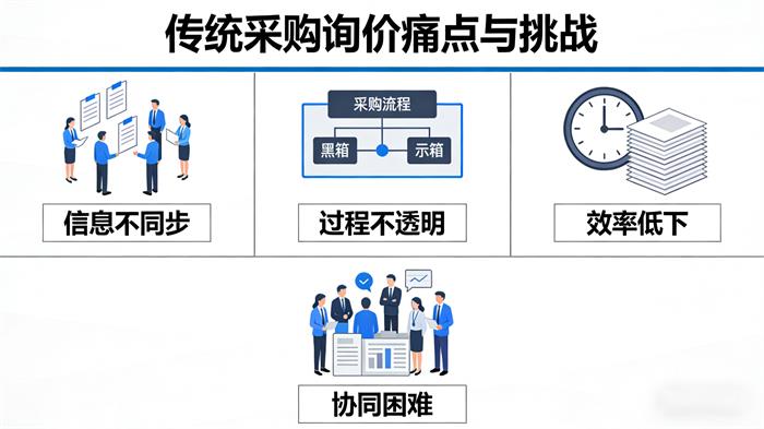 效率低下: 反复沟通、整理报价耗时耗力,拉长了整个采购周期,影响生产和运营节奏。